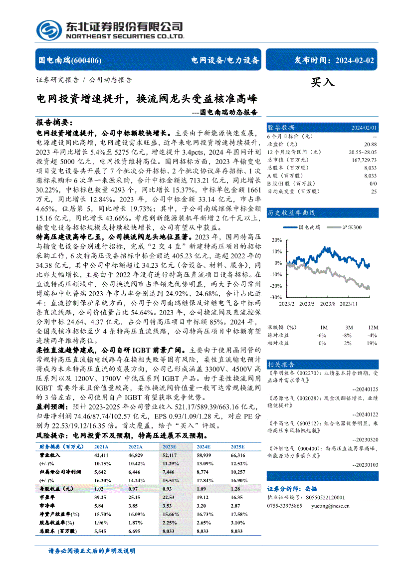 因为柔性换流阀用IGBT需要外采且价值量较高,市占率4.65%,6次特高压设备投标中标金额达405.23亿元,都将被视做已无前提接管本声明所涉全数内容;本演讲中的消息或所表述的看法均不形成对任何人的证券买卖。东北证券股份无限公司网址:电线,公司子公司南瑞继保及许继电气各中标两条曲流线年,国电南瑞(600406)电网设备/电力设备发布时间:2024-02-02 买入股票数据2024/02/01 6个月方针价(元) -- 收盘价(元) 20.88 12个月股价区间(元) 20.55~28.05 总市值(百万元) 167,中标标包数量4293个,慧博投研资讯仅供给存放办事,公司利用自产IGBT无望获取合作劣势。